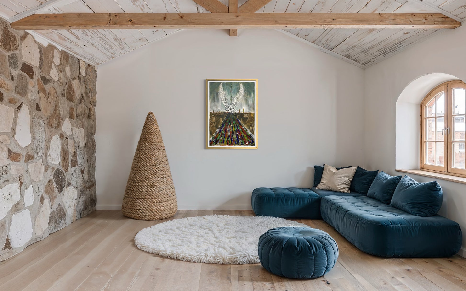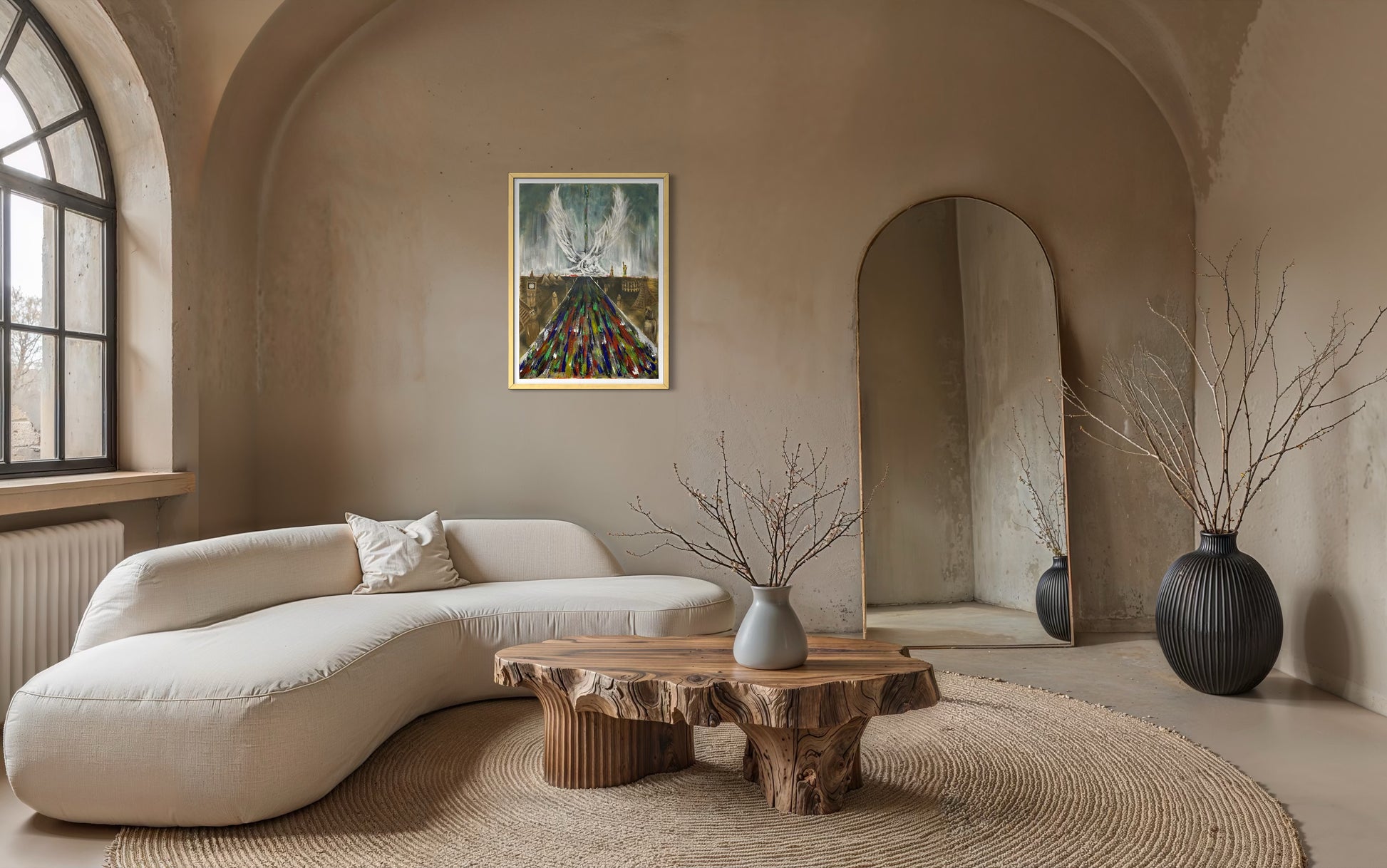 Les contrastes entre les couleurs intenses du chemin central et l’arrière-plan plus feutré créent une forte dynamique visuelle, invitant le spectateur à une lecture personnelle : voyage intérieur, quête de sens ou espoir d’unité.