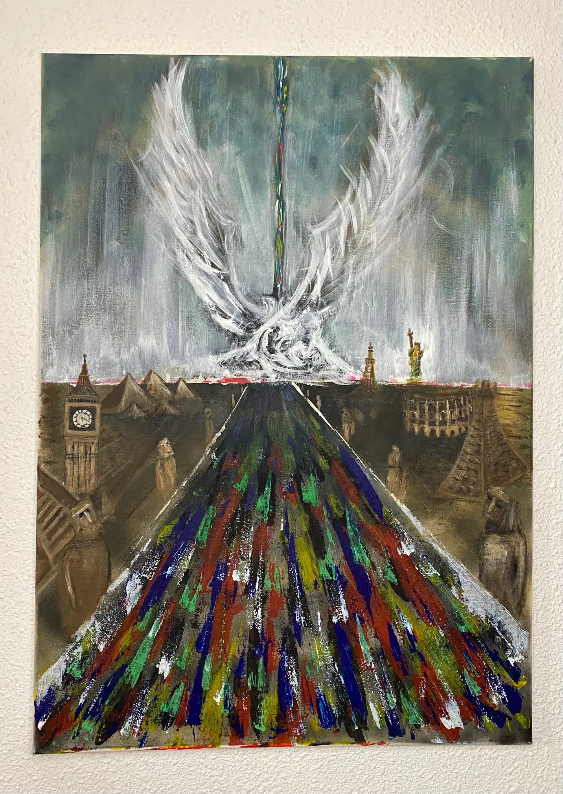 Cette œuvre puissante mêle abstraction et symbolisme universel. Au centre, une route éclatante de couleurs vives s’élève comme un fleuve de vie, reliant la terre au ciel. Elle semble porter l’histoire, les émotions et les espoirs de l’humanité vers un point de convergence lumineux.