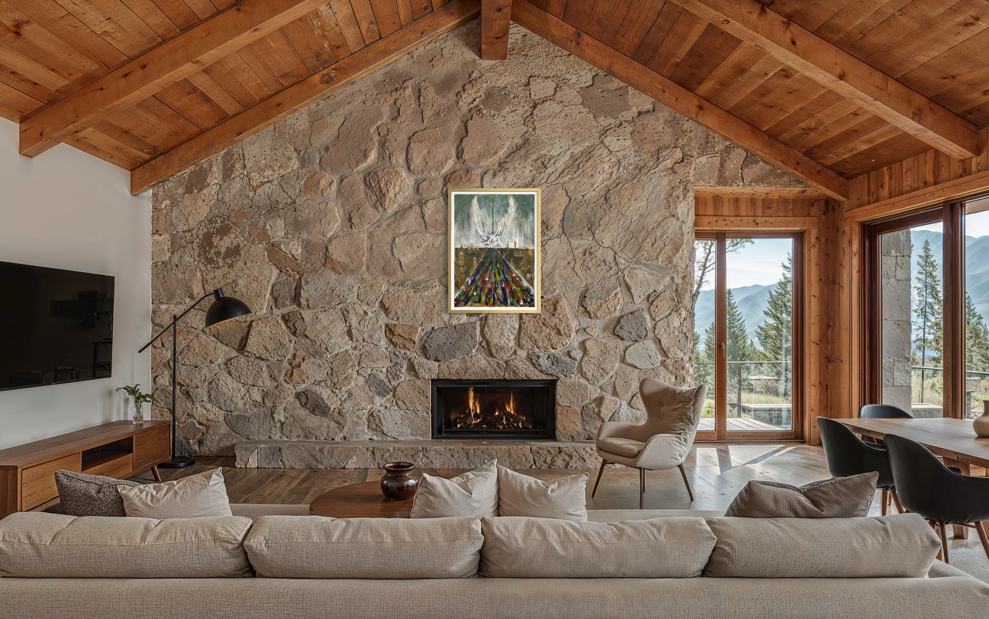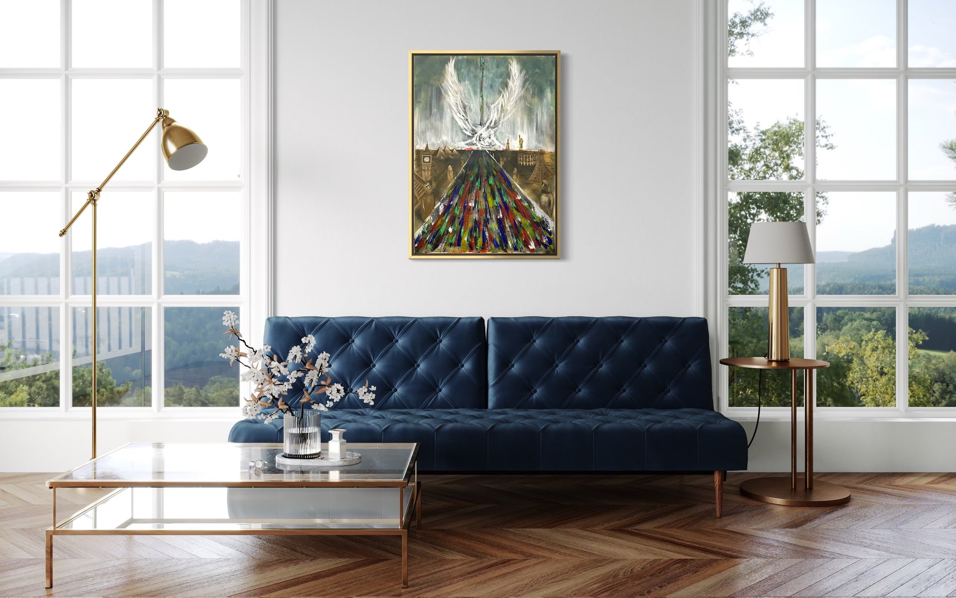 Au sommet, une forme ailée, éthérée et blanche, déploie ses ailes dans un mouvement ascendant, symbole de renaissance, de paix et d’élévation spirituelle. La verticalité lumineuse qui traverse la toile renforce cette impression de connexion entre le monde matériel et l’invisible.